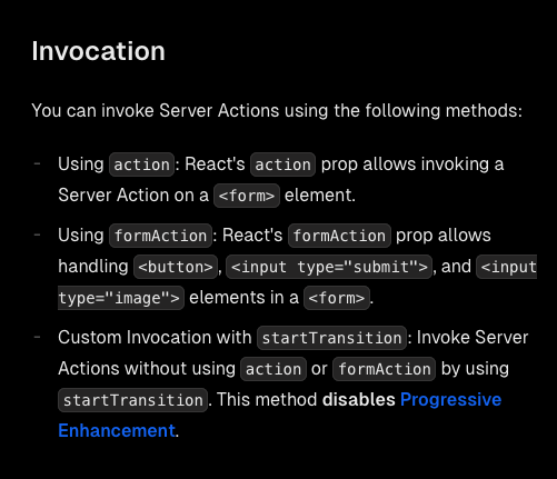 Hi Next.js users, you can invoke your server action from "anywhere" not only <form action={myAction}> 👋 All example codes were written with form action though. nextjs.org/docs/app/api-r…