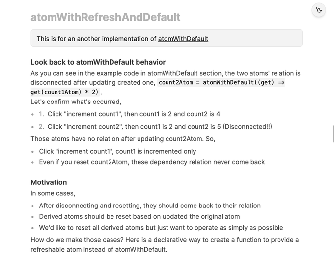 My decent work was merged. It's in a while. If you have experience using atomWithDefault in Jotai, you will be interested. You can try this by codesandbox in the doc. Hope it helps. Thanks @dai_shi 🙌 jotai.org/docs/recipes/a…