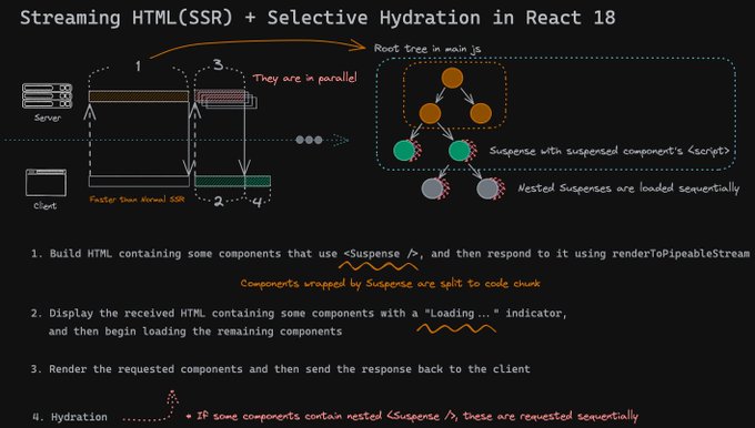 React Server Components の前に知っておいたほうが良さそうなStreaming HTMLとSelective Hydration。 Data fetchやcode splitしたいコンポーネントをSuspenseで囲んでおいて初期表示を速める(SSRという点はこれまでと変わらず)。残りの2,3,4もSSRなんだけど並列化可能。 全てSSRという点に注目。