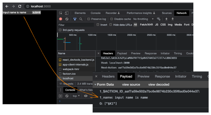 Server functions are called by POST with multipart/form-data in Next.js <form action={...}> or <form><button formAction={...} /></form>. ACTION_ID is a reference of the server function as an API endpoint.